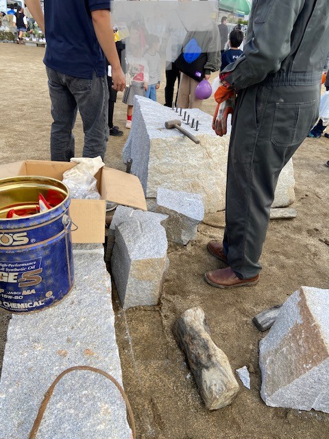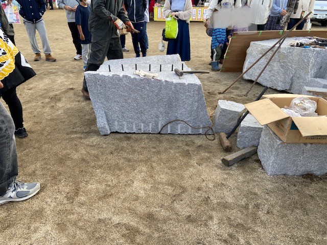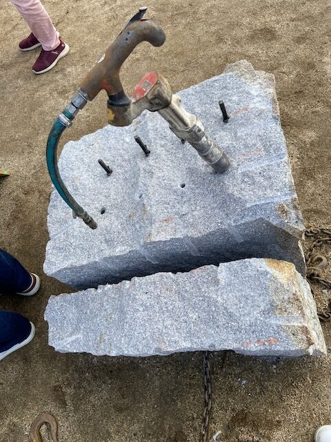 ドリルで穴をあけ、矢(鉄の突起)をゲンノウで叩き割ります。