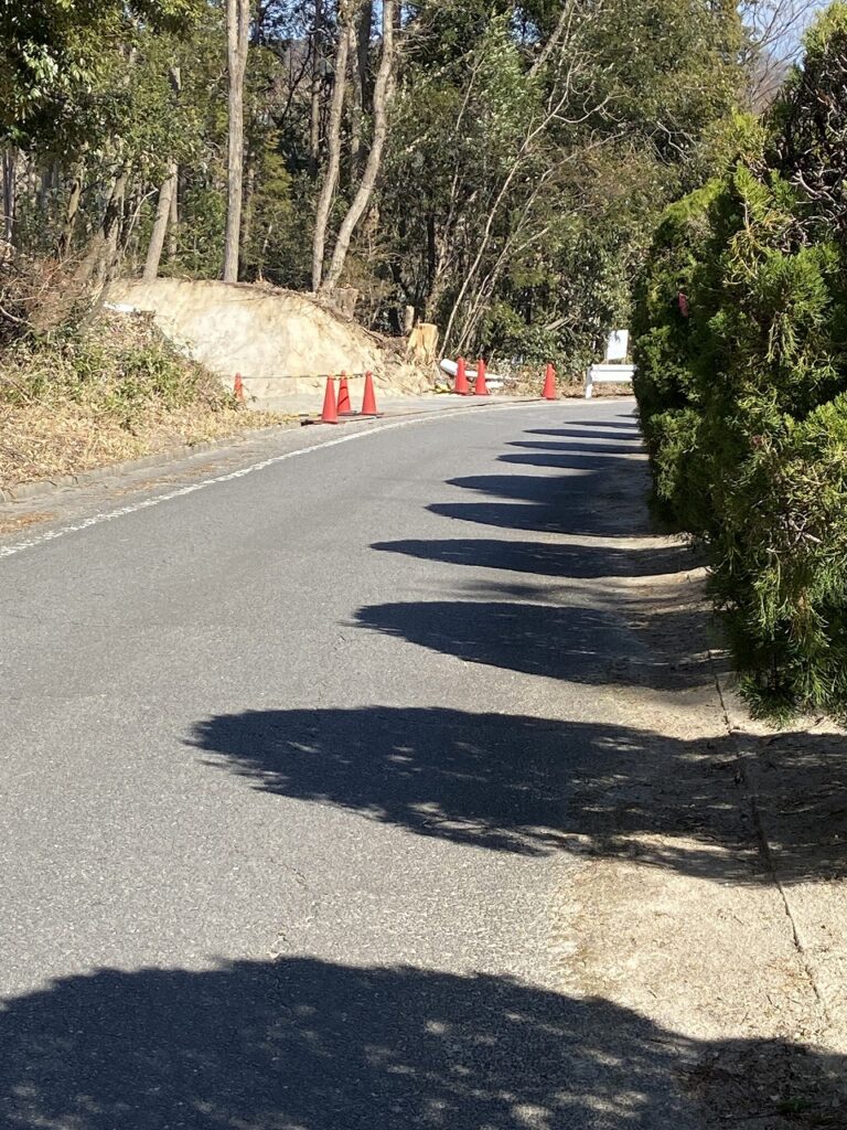 公園団地から帰られる(下りの道)途中にある山を切り開いております、工事車両が出入りしているようなので通行の際は、十分ご注意ください。